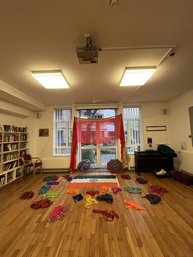 We decorated the space by draping a large red Sari and some colourful Indian Umbrellas. We also bought in loads of Indian scarves and Bindis for people to dress up in, to get them into the mood 🙂