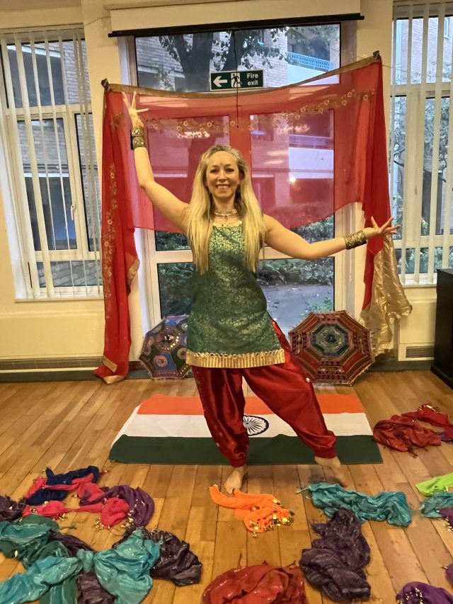 Next we got everyone standing and extending some of the moves we taught sitting down, to use the whole body. We kept it gentle and not too fast, so that everyone could join in. Bollywood is great as there are lots of little short moves that can be repeated, so that a short dance sequence miraculously appears. It’s great to see the joy on people’s faces as they move their body in rhythm to the music.